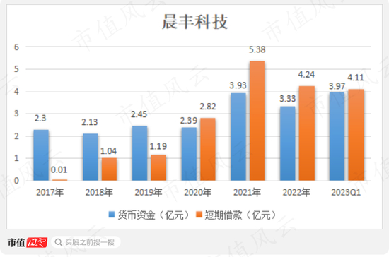 资金方面,截至2023年一季度,晨丰科技账面上货币资金3.97亿,短期借款4.11亿,偿债压力不算小。