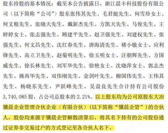 而以上37位小股东,均是晨丰科技原股东大冶骥晨企业管理合伙企业(以下简称“骥晨企管”)的合伙人,实控人为魏一骥。