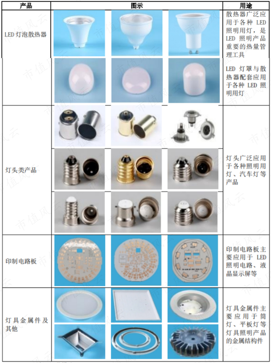 上文提过,晨丰科技的主要产品就是LED照明结构件,包括LED灯泡散热器、灯头类产品、印制电路板及灯具金属件等,主要为下游各照明厂商供货。