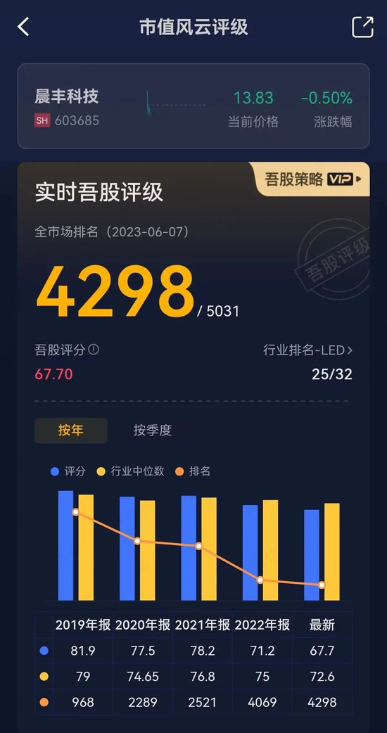 打开吾股评级,晨丰科技的排名已从2019年的968名,下滑到如今的4298名,是它应得的结果。