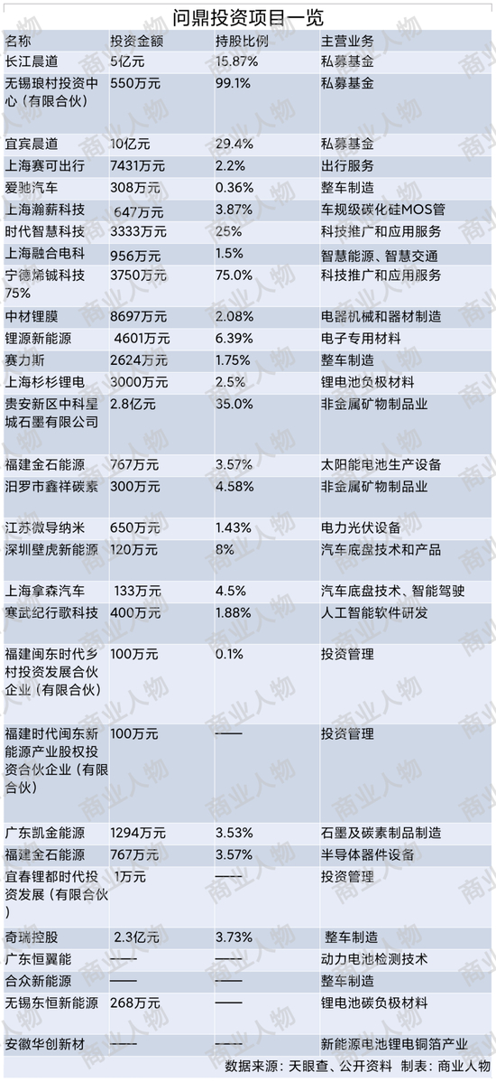 宁德时代新能源产业投资有限公司成立于2020年7月,对外投资数目不多,多为新能源相关公司。问鼎投资则是第二级投资的主力,其成立于宁德时代上市前的2017年,天眼查信息显示,问鼎投资对外投资近30家,拥有实际控制权的公司为40家。其投资标的,也多为新能源产业链公司。