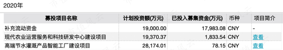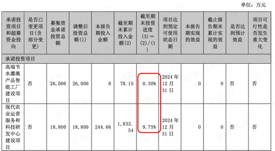 而另一个计划投入1.88亿的现代农业运营服务和科技研发中心建设项目,才投了1833万,投资进度9.75%。