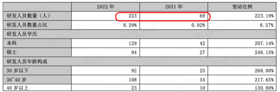 2022年大禹节水的研发人员从2021年的69名增加到了223人,增幅是223%。
