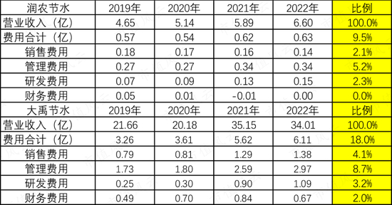 润农节水的销售、管理、研发、财务各项费用都比大禹节水低。