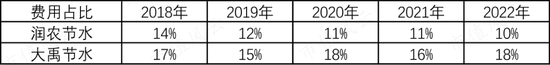 研发方面,润农节水2022年研发人员占比为23.8%,研发支出为3469万,占当期营业收入比例为5.26%;大禹节水2022年研发人员占比8.29%,研发支出为1.38亿,占当期营业收入比例为4.07%。