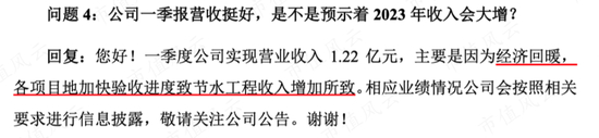 润农节水解释的原因是疫情结束之后,项目施工全面展开,各地政府验收都已恢复正常,1季度各地经济回暖,项目加快验收进度。