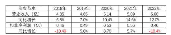 2018年以来,润农节水的收入从2018年的4.35亿增长到2022年的6.6亿,每年都有增长,但扣非净利润却原地踏步,依然是0.46亿。