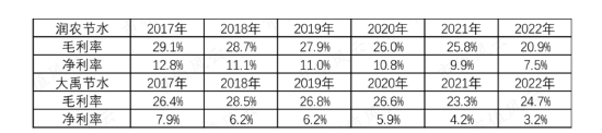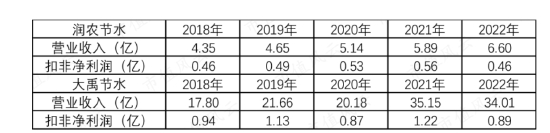 2022年大禹节水的营业收入为34亿,是润农节水的5倍左右,但净利润却只是润农节水的2倍左右。