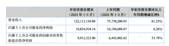 2023年1季度,润农节水的营业收入为1.22亿,同比增长61%,扣非净利润为991万,同比增长53%。