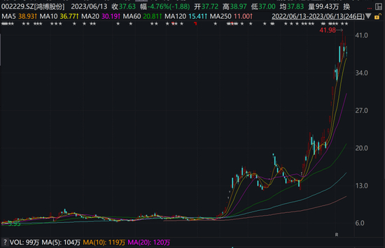 转折发生在今年1月下旬,从1月20日起,鸿博股份股价开始进入暴涨区间,一度从6.72元/股涨至6月12日的39.51元/股,5个月涨幅高达487.95%,成为资本市场的一匹黑马。而其股价大涨的原因,则和市场对ChatGPT概念股、AI概念股的追捧相关。