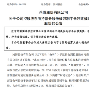 6月12日,鸿博股份公告,收到《强制平仓结果通知单》,控股股东之一河南寓泰控股有限公司(简称:寓泰控股),在财通证券的157.87万股于当日被强制平仓,资金用于归还寓泰控股在财通证券的融资。被动减持后,寓泰控股持股比则由14.3%降至13.98%,仍为上市公司第一大股东。