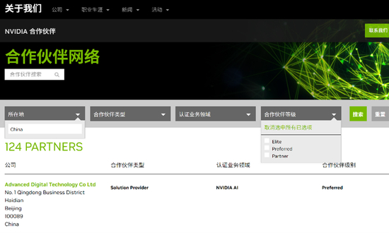 值得注意的是,目前在英伟达公司官网搜索其在中国的合作伙伴,共能搜到124个结果,包含先进数通、优创世纪、觉非科技等(其中某些有重复),但其中并没有鸿博股份。