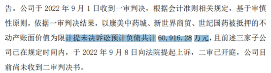 渤海信托将康美实业、康美中药城、新世界商贸、世纪国药、许冬瑾等15人列为被告。2022年,ST康美依据一审判决结果,以康美中药城、新世界商贸、世纪国药被抵押的不动产账面价值为限,计提未决诉讼预计负债共计6.09亿元。