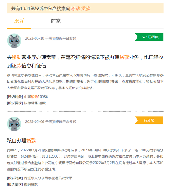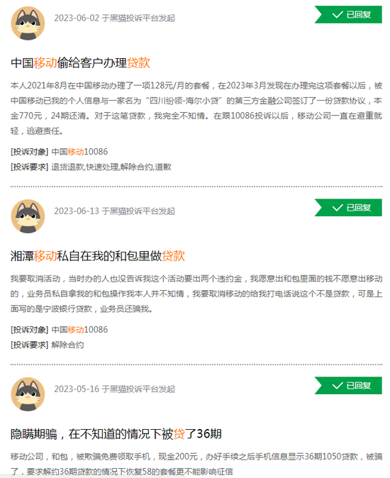 红星资本局梳理发现,全国多地网友都曾遭遇到过类似“送礼变贷款”的难题。红星资本局在黑猫投诉平台以“移动”“贷款”为关键词进行检索,发现有上千条网友投诉,内容包括在办理手机套餐、家庭宽带等业务的过程中,在业务员的“指引”下,签了贷款协议,办理了网络小额贷款、预授权冻结等金融业务,直到接到催收电话或产生不良征信后,才得知自己被“套路”了。除了中国移动外,中国联通的用户也曾反映过类似问题。
