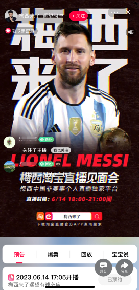从海报内容来看,梅西将于6月14日晚间亮相淘宝直播平台,开播时间为17点05分,梅西淘宝直播见面会的直播时间则在18:00-21:00间。