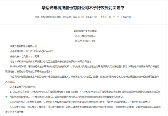 不过,红星资本局注意到,今年3月初,呼和浩特市生态环境局在官网公开了一份关于华耀光电的不予行政处罚决定书。
