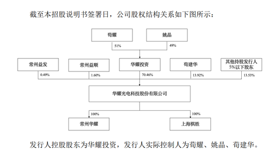 截至招股书签署日,荀耀、姚晶夫妇通过华耀晶杰投资集团有限公司(下称“华耀投资”)持有华耀光电70.46%的股份,荀建华直接持有13.92%的股份,姚志中仅间接持股0.08%。