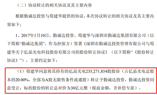 直到2017年5月26日,亿晶光电发公告重新说明,荀建华与勤诚达投资在当年1月签署的协议涉及的转让股权即为2.35亿股(占总股本的20%),交易价格为30亿元。