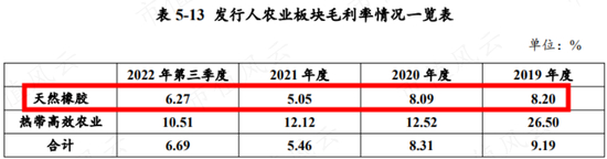 在农业板块下面,天然橡胶又是盈利能力较差的一块业务,毛利率低于农业板块整体。