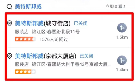 记者搜索本地生活平台发现,美特斯邦威在春熙路附近原本有两家门店,但目前两家门店的搜索结果均显示为“已关闭”状态。