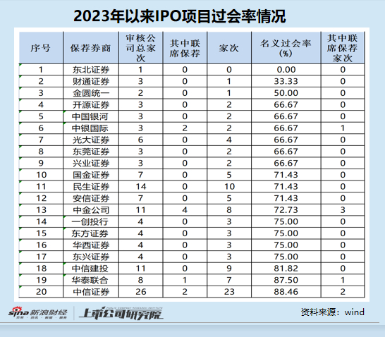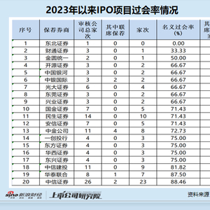 具体到保荐券商,共有24家券商保荐项目的名义过会率为100%,东北证券IPO保荐项目的过会率为0,财通证券以33.33%的名义过会率排倒数第二。事实上,财通证券最近两年IPO保荐项目的名义过会率一直走低。2020年、2021年、2022年的名义过会率分别为100%、60%、71.43%。