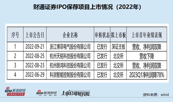 2022年,财通证券共有4家IPO保荐项目上市,分别是浙江博菲电气股份有限公司(博菲电气)、杭州天铭科技股份有限公司(天铭科技)、朗鸿科技、科润智能控制股份有限公司(科润智控),有3家项目出现了营收或净利润下降,占比75%。