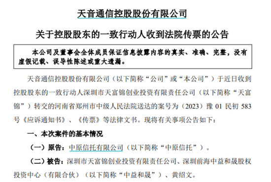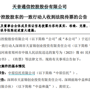 公告显示,天音控股于近日收到控股股东的一致行动人天富锦转交的郑州市中级人民法院送达的传票。