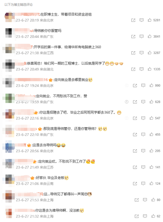 对此网友直言:“周总都53岁了,不知道带他的博士生导师是谁,没准儿年龄比他小”、“这是去当导师吗”。也有网友调侃称:“在职博士生,带着项目和资金进组”、“太卷了!”。