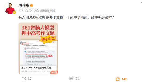 6月7日,周鸿祎借助高考的热度,用360智脑写了一篇高考作文,并邀请网友打分。并声称“有人用360智脑押高考作文题,十道中了两道”。