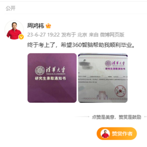 6月27日晚间,360公司创始人、董事长兼CEO周鸿祎微博发文表示:“终于考上了,希望360智脑帮助我顺利毕业。”并附上清华录取通知书的照片。