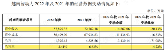 但2022年,越南智动力交上的答卷是:营收下滑20.43%,毛利率仅有2.41%,最终亏损5,987万。