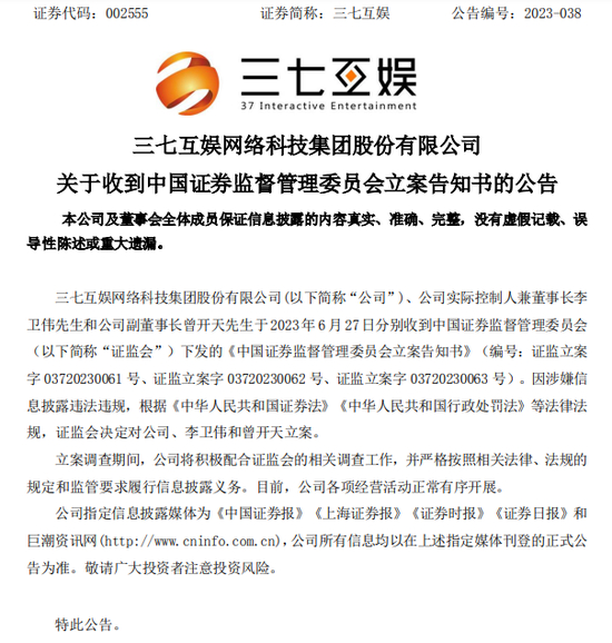 对于被证监会立案调查,三七互娱回应称,立案调查期间,将积极配合证监会的相关调查工作,并严格按照相关法律、法规的规定和监管要求履行信息披露义务。目前,公司各项经营活动正常有序开展。