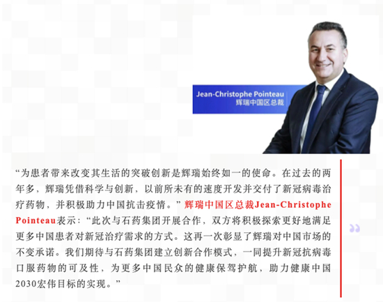 辉瑞中国区总裁Jean-Christophe Pointeau表示:“此次与石药集团开展合作,双方将积极探索更好地满足更多中国患者对新冠治疗需求的方式。期待与石药集团建立创新合作模式,一同提升新冠抗病毒口服药物的可及性。”