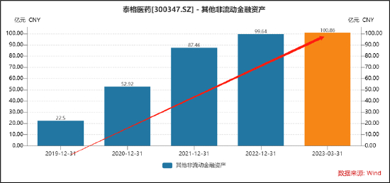 在投资业务加持下,公司的其他非流动金融资产也极具攀升,由2019年的22.5亿元上涨至2023年一季报末的100.86亿元。其中,2022年年末,医药基金高达49亿元,非上市公司股权高达47亿元。