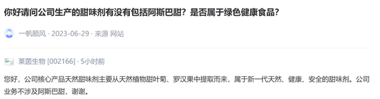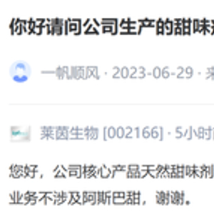 6月30日,莱茵生物证券部工作人员曾对外表示,公司目前主要产品是甜菊糖苷、罗汉果甜苷,两个都是天然甜味剂,近期阿斯巴甜的消息对非人工甜味剂的企业和市场肯定是利好,但也要看下游品牌方是否愿意选择其他甜味剂来代替原来的配方。