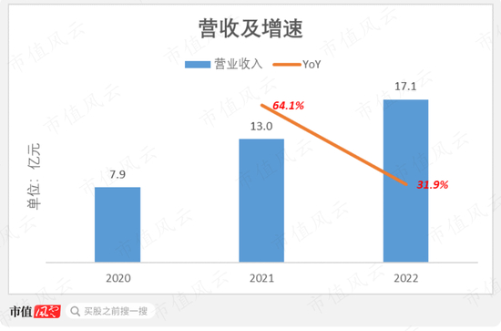 2020-2022年,公司营收从7.9亿元增至17.1亿元,期间CAGR为47%,2022年同比增32%。