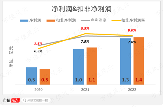 2022年,公司净利润和扣非净利润(注:差异主要来自政府补贴)分别为1.3亿元和1.4亿元,对应净利润率和扣非净利润率分别为8.0%和7.8%。