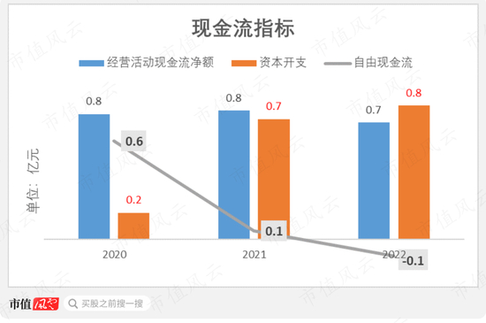 然而,2021年以来大幅扩张的资本开支,导致公司的自由现金流明显紧张,并在2022年由正转负,为-0.1亿元。