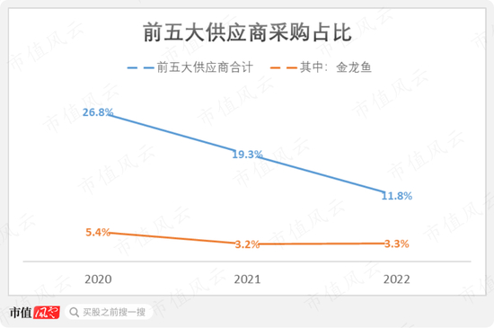 期间,公司向前五大供应商的合计采购金额占比,也从2020年的26.8%下降至2022年的11.8%。其中,2022年的最大供应商金龙鱼,采购金额占比为3.3%。