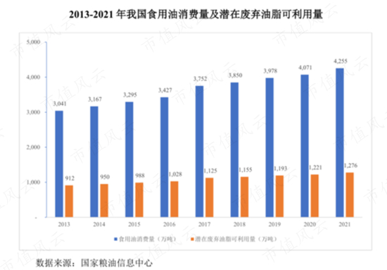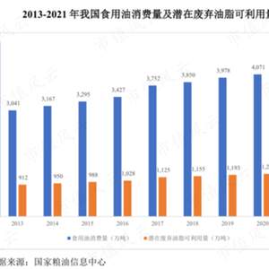 以废弃油脂约占食用油消费量的30%估算,2021年,我国产生的废弃油脂超过1200万吨。再考虑到油脂精加工、肉及肉制品加工等过程中的下脚料油,我国废弃油脂的年供应潜力超过1300万吨。