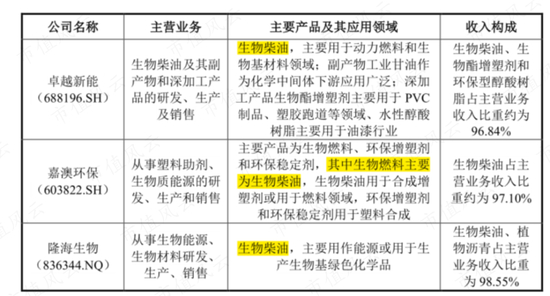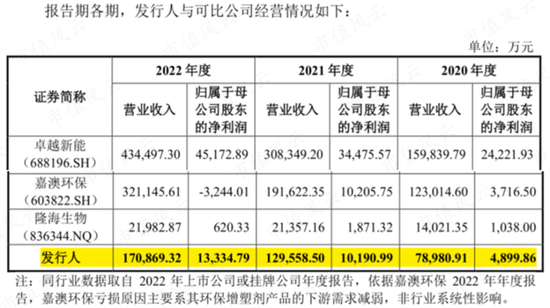 在已上市的同行可比公司中,公司体量次于卓越新能和嘉澳环保,高于隆海生物。