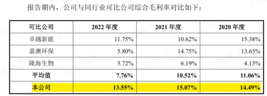2022年,公司毛利率为13.6%,高于卓越新能的11.8%和嘉澳环保的5.8%。