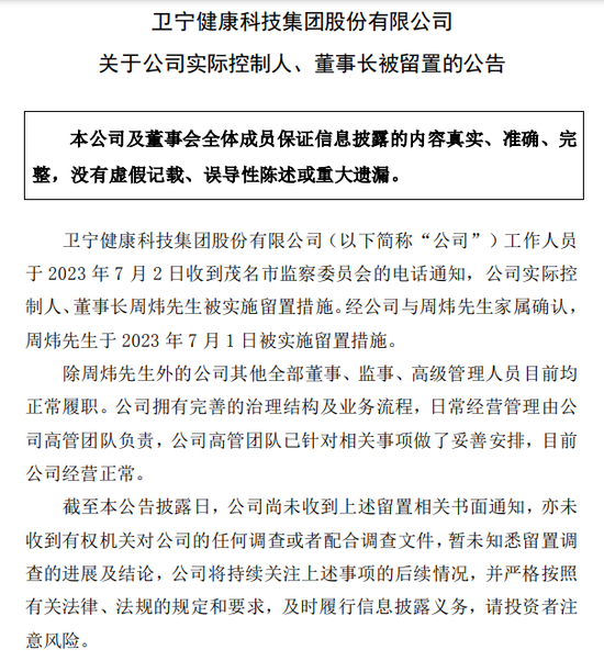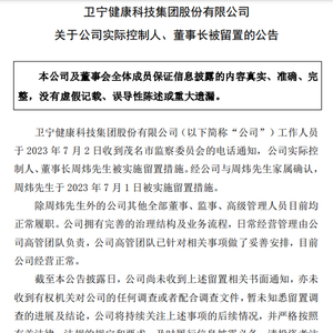 7月3日早间,卫宁健康(300253)发布公告,其表示已于7月2日收到茂名市监察委员会的电话通知,公司实控人、董事长周炜被实施留置措施。经公司与其家属确认,周炜于7月1日被实施留置措施。
