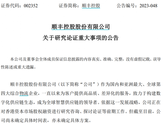 在公告中,顺丰控股表示,公司正在对香港资本市场股权融资进行研究咨询、探讨论证等前期工作。但截至目前,公司尚未确定具体时间表,亦未确定具体方案。