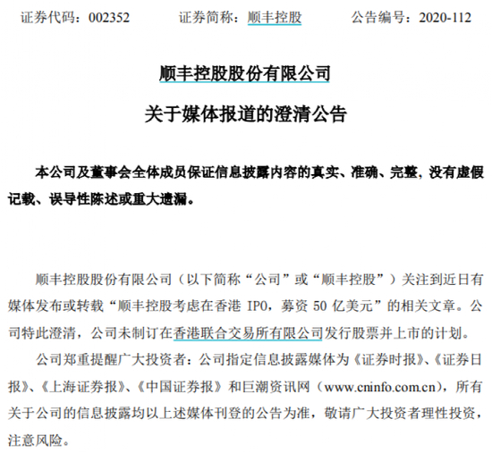 2020年11月,有市场传闻称,“顺丰控股考虑在香港IPO,募资50亿美元。”此后,顺丰控股澄清,公司未制订在香港联合交易所有限公司发行股票并上市的计划。