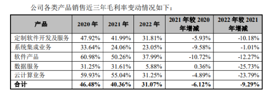 数据显示,东方国信2020年至2022年销售毛利率持续下降,分别为 46.48%、40.36%、31.07%。