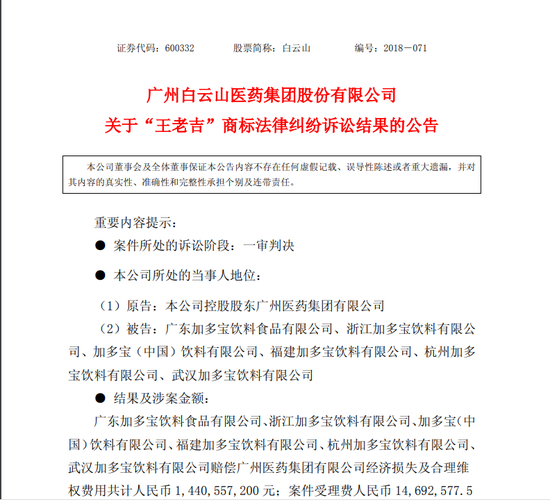 据广药集团子公司白云山2018年7月公告,广东高院关于“王老吉”商标法律纠纷案件的一审《民事判决书》显示,广东加多宝饮料食品有限公司、浙江加多宝饮料有限公司、加多宝(中国)饮料有限公司、福建加多宝饮料有限公司、杭州加多宝饮料有限公司、武汉加多宝饮料有限公司(合称为“六加多宝”)被判赔偿广药集团经济损失及合理维权费用共计人民币14.41亿元。