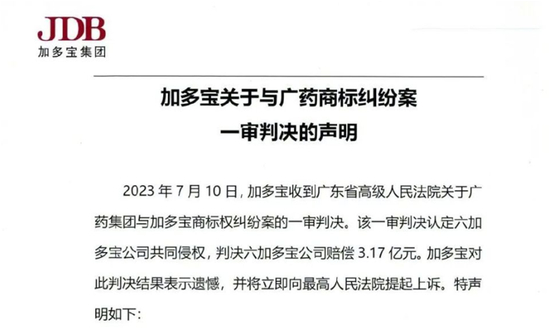 加多宝称,对此判决结果表示遗憾,并将立即向最高人民法院提起上诉。此一审判决不会对加多宝产生任何影响。