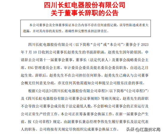 7月10日晚间,四川长虹发布公告,已掌舵四川长虹19年的赵勇,申请辞去公司董事长等一切职务。