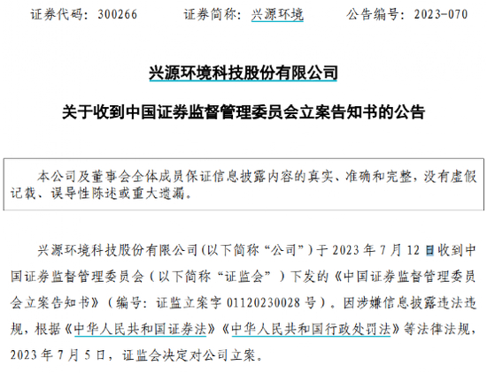 兴源环境发布公告称,公司于7月12日收到中国证监会下发的《立案告知书》(编号:证监立案字01120230028号)。因涉嫌信息披露违法违规,根据相关法律法规,中国证监会决定对公司立案。